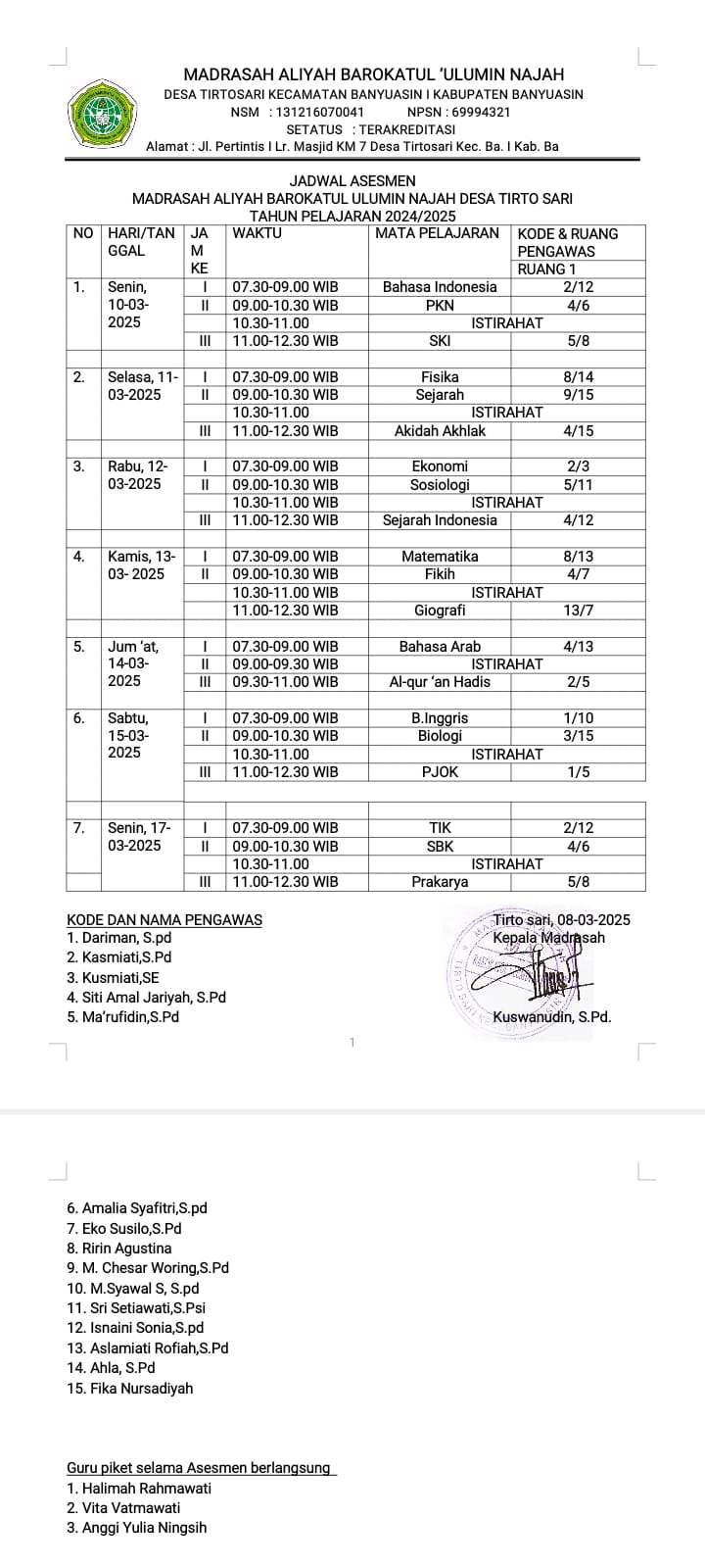 JADWAL ASESMEN MADRASAH ALIYAH BAROKATUL 'ULUMIN NAJAH